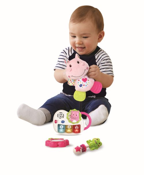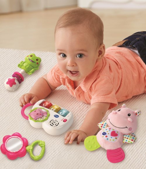 Prvý darček pre bábätko od VTech® je jedinečný súbor hračiek pre práve narodené bábätko, ktoré mu v prvých mesiacoch jeho života budú prinášať veľa radosti a poznania. Súčasťou je: Hrajúce a spievajúce piáno, hebký hrošík, zrkadlo, hrkálka žabička 1. Hrajúce a spievajúce piáno. Hovorí a spieva po česky. Stlačením svietiacich klávesov sa dieťa dozvie niečo o zvieratách, číslach, farbách, tvaroch, začuje zábavné pesničky a melódie. Blikajúce klávesy stimulujú zrakové vnímanie. Rukoväť piánka je prispôsobená malým detským ručičkám podporuje tak aj rozvoj jemnej motoriky dieťaťa. 2. Hebký hrošík. Zamatovo hebký hrošík s nožičkami na žužlaní a hryzenie. Svojím tvarovaním a textúrami rozvíja hmatovú stimuláciu dieťaťa. Nohy hrošíka určené na hryzenie, masírujú aj chladia ďasná dieťaťa, a pomáhajú nielen na upokojenie dieťaťa, ale aj od bolestí, ktoré môžu prvé zúbky spôsobovať. 3. Zrkadlo. S ľahko uchopiteľným držadlom rozvíja sebapoznávanie dieťaťa. 4. Hrkálka žabička. Trepaním hrkálkou rozvíja dieťa motorické zručnosti aj zvukové vnímanie.