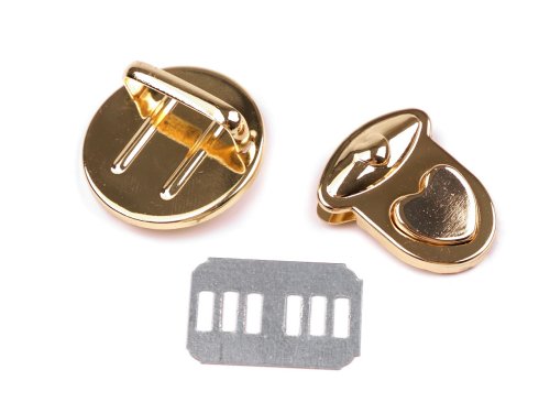 Sada zapínania na kabelku či tašku sa skladá z troch dielov. Jeden diel sa pripevní na vnútornú časť tašky, druhý (s nôžkami) na vonkajšiu časť a tretí diel na jej chlopňu. Diel na chlopňu sa upevní tak, že roztvoríte čeľuste, na ktorých sú zúbky a medzi ne vložíte materiál, na ktorý chcete zapínanie upevniť. Následne čeľuste zovrite, zúbky tak zamedzia pohybu látky. Zapínanie zdobí gombík v tvare srdiečka. Rozmery viď foto: - vnútorný diel: Ø30 mm - vonkajší diel: Ø30 mm - diel na chlopňu: 25 x 30 mm Celkové rozmery po zapnutí sú 30 x 32 mm.