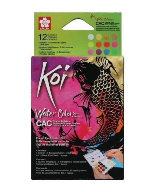 Koi Water Colors 12 Creative Art Colors (CAC) je sada akvarelových farieb plná jedinečných farieb a povrchových úprav pre jedinečné projekty. Táto kompaktná sada obsahuje 4 metalické a 8 fluorescenčných farieb a obsahuje miešaciu paletu vo viečku krabičky, hubku a Koi Water Brush (štetec s nádržkou na vodu). Vytvorte si vlastné jedinečné farby zmiešaním metalických a fluorescenčných farieb alebo preskúmajte úplne nové spektrum úžasných efektov zmiešaním týchto kreatívnych umeleckých farieb s tradičnými akvarelovými farbami. Bohatý farebný sortiment Koi ponúka možnosť voľby pri vytváraní odvážnych odtieňov alebo jemných a decentných odtieňov s pridaním metalických a fluorescenčných akvarelových farieb. Majte túto malú sadu po ruke vo svojom ateliéri pre rýchle striekanie farieb a vytváranie hlbokých tieňov pre pozadie. Alebo si ju zoberte so sebou na tvorbu portrétov a plenérových krajín v prírode. Táto krabička vreckovej veľkosti sa tiež skvele hodí na pridávanie farieb do komiksov, ilustrácií a projektov s písmom.