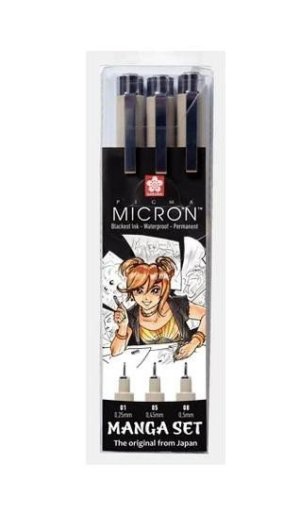 Sada nástrojov Manga s 3 perami Pigma Micron 01, 05 en 08 čierna. Staňte sa skutočným manga-profesionálom! Sakura Pigma Color Technologies; Pigma bola prvým atramentom na svete, ktorý kombinoval pigmenty a vodu. Vďaka jemnému hrotu je toto pero ideálne na tvorbu technických i umeleckých kresieb. Atrament nepresvieti cez papier.