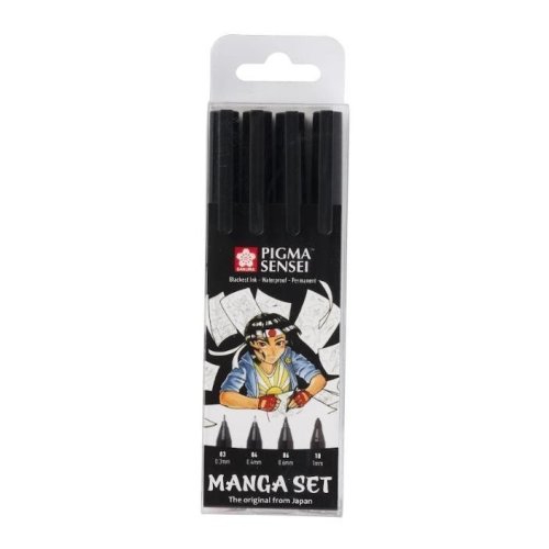 Naučte sa kresliť ako profesionáli pomocou pier Pigma Sensei® s rovnakým sýto čiernym atramentom Pigma®, ktorý je už viac ako 30 rokov dôveryhodným atramentom profesionálov v oblasti Manga. Používajte jemné linky na výrazy tváre, nápisy a detaily alebo výrazné linky na zvýšenie pôsobivosti a dramatickosti. Táto sada obsahuje: 4 x Pigma Sensei: 03 ultrajemný hrot (0,3 mm), 04 odolný plastový hrot (0,4 mm), 06 guľový vláknový hrot (0,6 mm), 10 odvážny vláknový hrot (1 mm).