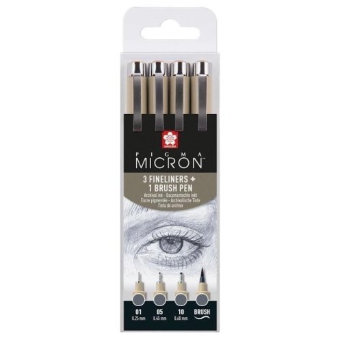 Výber 4 chladne šedých pier Pigma Micron a štetcových pier: Pigma Micron 01 (0,25 mm), Pigma Micron 05 (0,45 mm), Pigma Micron 10 (0,60 mm) a Pigma Brush.