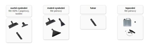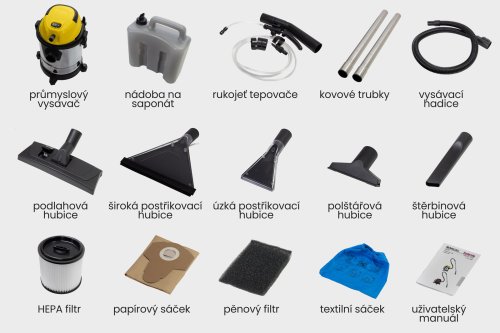 • Priemyselný vysávač • Nádoba na saponát • Rukoväť tepovača • Kovové rúrky • Vysávacia hadica • Podlahová hubica • Široká postrekovacia hubica • Úzka postrekovacia hubica • Vankúšová hubica • Štrbinová hubica • Hepa filter • Papierový manuál