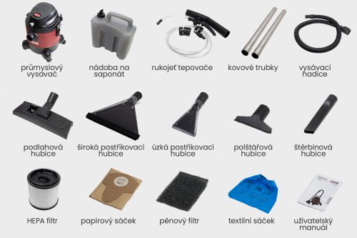 • Priemyselný vysávač • Nádoba na saponát • Rukoväť tepovača • Kovové rúrky • Vysávacia hadica • Podlahová hubica • Široká postrekovacia hubica • Úzka postrekovacia hubica • Vankúšová hubica • Štrbinová hubica • Hepa filter • Papierový manuál