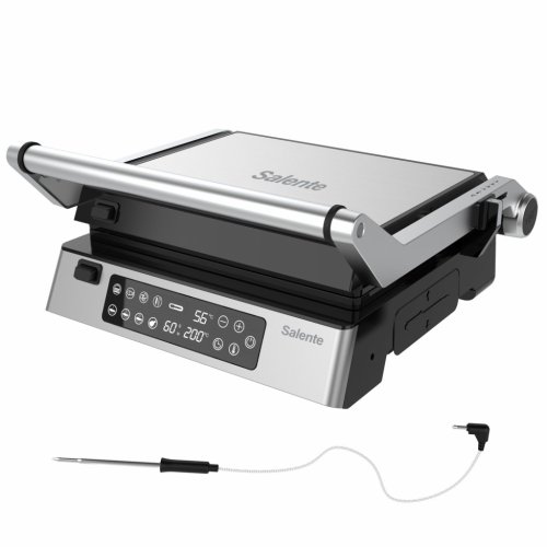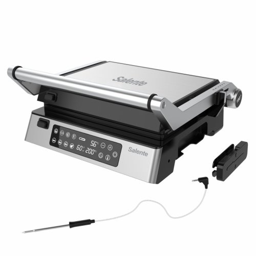 Spolu s grilom je dodávaná externá teplotná sonda, ktorej ihlu stačí zapichnúť do mäsa a na displeji sa ihneď zobrazí okamžitá teplota mäsa. Na dotykovom ovládacom paneli si nastavíte požadovanú cieľovú teplotu a gril vás akustickým signálom upozorní na jej dosiahnutie. Nárast teploty sondy môžete po celý čas grilovania veľmi pohodlne sledovať na displeji a získať tak dokonalú kontrolu nad prepečenosťou mäsa. Cieľovú teplotu je možné ľubovoľne meniť dokonca aj v priebehu grilovania bez toho, aby bolo potrebné ihlu vybrať z mäsa. Cieľovú teplotu je možné nastaviť od 45 do 90 °C v krokoch po 1 °C. Veľmi praktický je potom úložný box pre sondu aj jej kábel. Celý box je vďaka magnetickému uchyteniu efektne skrytý v tele grilu na jeho bočnej strane - sondu tak máte vždy po ruke a nemôžete ju stratiť.