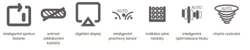 Sústava čidiel v spojení s farebným digitálnym displejom informuje užívateľa o všetkom podstatnom. Zobrazí stav batérie pri vysávaní alebo nabíjaní, zvolený pracovný režim, potrebu vyprázdniť nádobu na prach alebo zablokovanú rotačnú kefu.