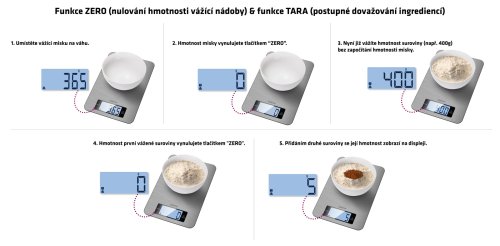 Funkcia ZERO (nulovanie hmotnosti vážiacej nádoby) & funkcia TARA (postupné dovažovanie ingrediencií)