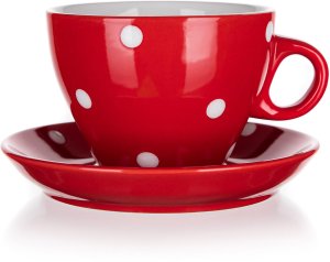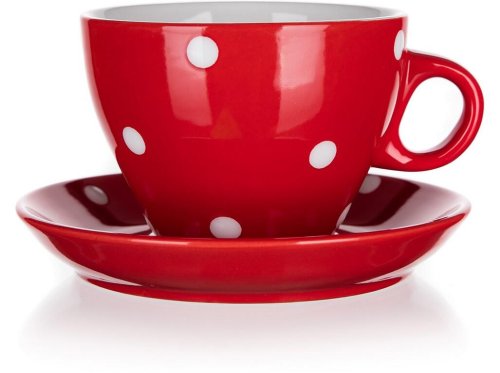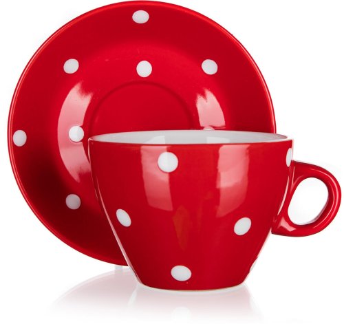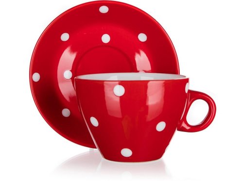 Šálka s tanierikom DOTS, červená s bielymi bodkami je vyrobená z kvalitnej keramiky. Možno použiť do mikrovlnnej rúry aj do umývačky na bežné domáce použitie.