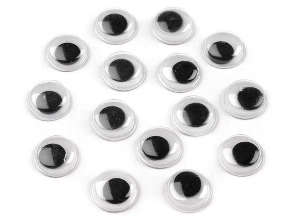 Plastové oči dodajú tvári ľudí alebo zvierat veselý pohľad a budú tou správnou bodkou vášho dekoratívneho snaženia. Čierna šošovka je pohyblivá. Spodná strana je opatrená samolepiacou fóliou. Nalepenie očí je ľahké. Odlepte spodný krycí papier a oči prilepte na suchý, čistý, pevný povrch. Široké uplatnenie nájdu pri tvorbe originálnych prianí technikou scrapbooking.