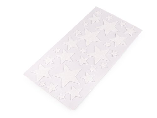 Dekoračné hviezdy s glitrami sú vyrobené z penovej gumy (moosgummi). Na spodnej strane majú samolepiacu vrstvu. Sú vhodné na nalepenie na zabalené darčeky, pozvánky, krabičky, albumy, denníky a pod. Sú nalepené na jednom archu podkladovej fólie, z ktorej sa pohodlne odlepia. Odporúčame ich lepiť na suchý, hladký a pevný povrch. Priemery hviezd sú 1,7 cm, 2,5 cm, 3 cm, 4,7 cm, 6 cm, 6,5 cm a 7 cm.