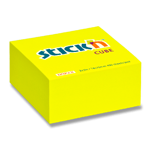 Samolepiace bloček v tvare kocky. Veľkosť 76 x 76 mm, 400 listov, neónová, žltá.