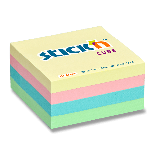Samolepiace bloček v tvare kocky. Veľkosť 76 x 76 mm, 400 listov, 4 pastelové farby.