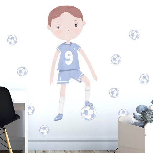 Krásna nálepka na stenu Futbalista. Každý chlapec sníva o tom, stať sa slávnym futbalistom. Vďaka našej nálepke sa deti môžu presťahovať na futbalové ihrisko a cítiť sa ako skutočná futbalová hviezda. Nálepka je krásnou dekoráciou, zároveň chráni stenu pred nečistotami alebo poškodením. Samolepka je zaistená špeciálnym matným laminátom, ktorý ju chráni pred poškriabaním pri každodennom používaní a zároveň uľahčuje lepenie – fólia je silnejšia a ľahšie sa prenáša na stenu. Ak hľadáte dokonalý spôsob, ako oživiť detskú izbičku, naše samolepky na stenu sú tou správnou voľbou. Objednajte si ich ešte dnes a urobte radosť svojmu dieťaťu. Táto sada obsahuje: 1 futbalistu, sadu 10 lôpt. Presné rozmery každej časti nálepky sú uvedené na poslednej fotografii.