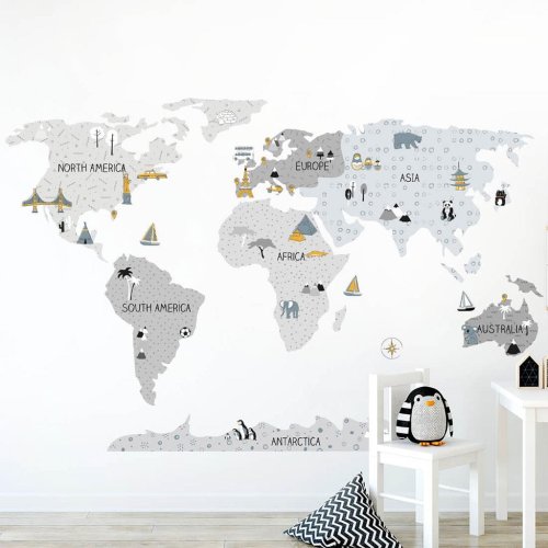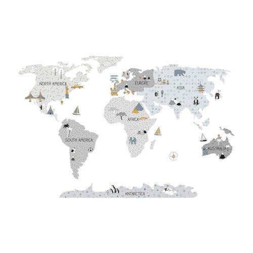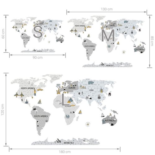 Krásna nálepka na stenu Mapa S. Šedé mapy sveta sú produkty najvyššej kvality, vyrobené s maximálnou starostlivosťou a pozornosťou k detailom, udržované v tlmených škandinávskych farbách, ktoré dokonale zapadnú do priestoru dieťaťa. Mapy sú nielen jedinečnou dekoráciou, ale aj senzačným spôsobom učenia hrou. Deti spoznávajú kontinenty, oceány a svetové strany, ale aj pamiatky a zaujímavosti daného regiónu či štátu. Každý prvok mapy je starostlivo vyrezaný z obrysu a nalepený samostatne, čo uľahčuje aplikáciu, najmä v prípade veľkých priestorov. Veľkosť samolepky sa meria po jej aplikácii na stenu, pričom kontinenty sú od seba v patričnej vzdialenosti. Samolepka je zaistená špeciálnym matným laminátom, ktorý ju chráni pred poškriabaním pri každodennom používaní a zároveň uľahčuje lepenie – fólia je silnejšia a ľahšie sa prenáša na stenu. Ak hľadáte dokonalý spôsob, ako oživiť detskú izbičku, naše samolepky na stenu sú tou správnou voľbou. Objednajte si ich ešte dnes a urobte radosť svojmu dieťaťu. Táto sada obsahuje: kontinenty, ostrovy a doplnkové (vzdelávacie) prvky S (90x60 cm). Presné rozmery každej časti nálepky sú uvedené na poslednej fotografii.