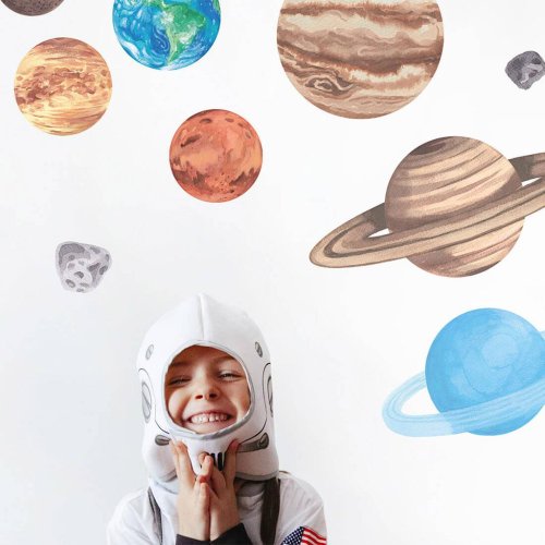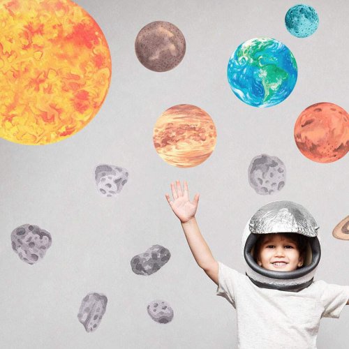 Krásna nálepka na stenu Slnečná sústava S. Samolepky slnečnej sústavy sú skvelým spôsobom, ako pridať do detskej izby nadpozemský vesmírny motív. Sada samolepiek obsahuje 8 planét: Merkúr, Venuša, Zem, Mars, Jupiter, Saturn, Urán a Neptún. Súprava tiež obsahuje slnko, mesiac a niekoľko asteroidov. Samolepka je zaistená špeciálnym matným laminátom, ktorý ju chráni pred poškriabaním pri každodennom používaní a zároveň uľahčuje lepenie – fólia je silnejšia a ľahšie sa prenáša na stenu. <BR>Objednajte si ich ešte dnes a urobte radosť svojmu dieťaťu. Presné rozmery každej časti nálepky sú uvedené na poslednej fotografii.<BR>Upozornenie: Neodporúčame aplikovať naše samolepky na steny natreté latexovými, hladkými alebo voskovými farbami.<BR>- rozmery: zobrazené na poslednej fotografii<BR>- materiál: najkvalitnejšia PVC fólia< BR>- ochrana: odolná proti poškriabaniu matný laminát<BR>- odolný: fólia odolná vlhkosti a UV žiareniu<BR>- vyrezaná: mimo obrysu - nemajú podklad<BR>-balenie: balené v eko tubách
