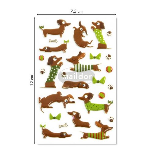 Samolepky Maildor 3D Cooky s motívmi rozvádzaných jazvečíkov as efektom 3D. Balenie obsahuje 1 hárok s 26 samolepkami. Rozmer balenia 7,5 x 12 cm.