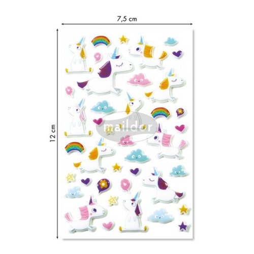 Samolepky Maildor 3D Cooky s motívmi jednorožcov as efektom 3D. Balenie obsahuje 1 hárok so 40 samolepkami. Rozmer balenia 7,5 x 12 cm.