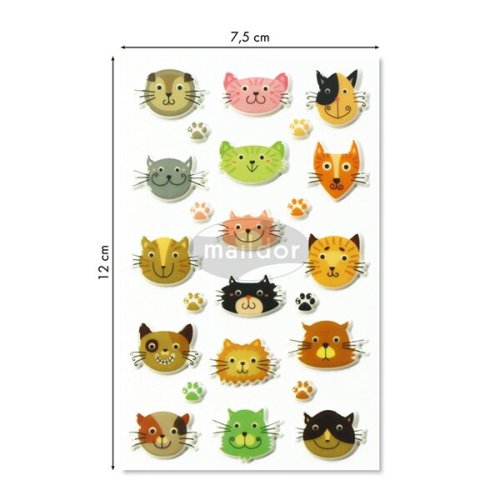 Samolepky Maildor 3D Cooky s motívmi mačacích hlavičiek as efektom 3D. Balenie obsahuje 1 hárok s 24 samolepkami. Rozmer balenia 7,5 x 12 cm.