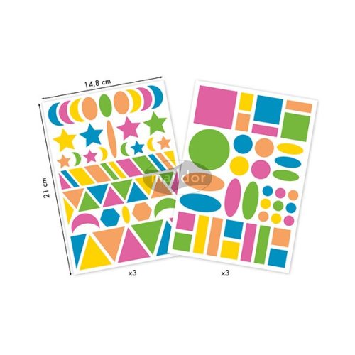 Samolepky Maildor Baby veľké veľkosti pre jednoduchú manipuláciu s detskými motívmi geometrických tvarov. Balenie obsahuje 6 listov, 2 motívy po 3 ks. Samolepky je možné zlúpnuť a znovu nalepiť, vhodné pre deti už od 2 rokov. Rozmery balenia: 14,8 x 21 cm.