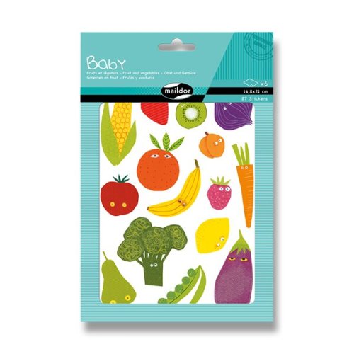 Samolepky Maildor Baby veľké veľkosti pre jednoduchú manipuláciu s detskými motívmi ovocia a zeleniny. Balenie obsahuje 6 listov, 2 motívy po 3 ks. Samolepky je možné zlúpnuť a znovu nalepiť, vhodné pre deti už od 2 rokov. Rozmery balenia: 14,8 x 21 cm.