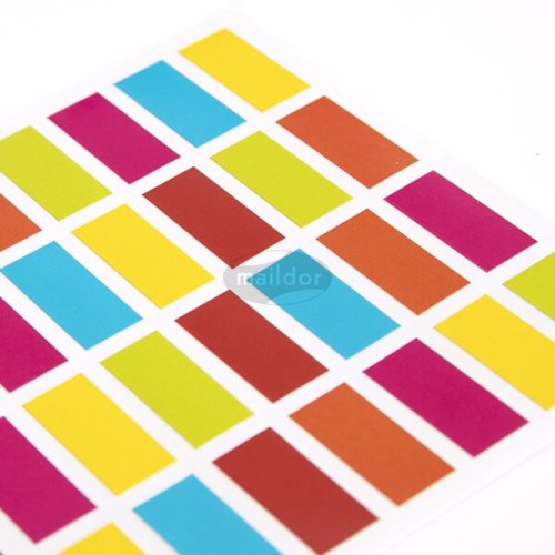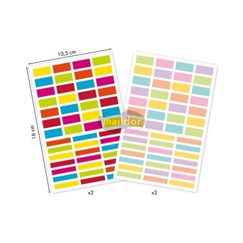 Samolepky Maildor Inital s rôznymi farbami a veľkosťami obdĺžnikov. Balenie obsahuje 4 listy, 2 motívy po 2 ks. Samolepky je možné zlúpnuť a znovu nalepiť. Rozmery balenia: 10,5 x 16 cm.