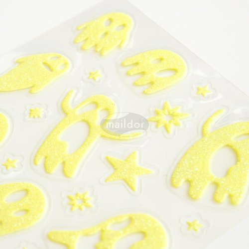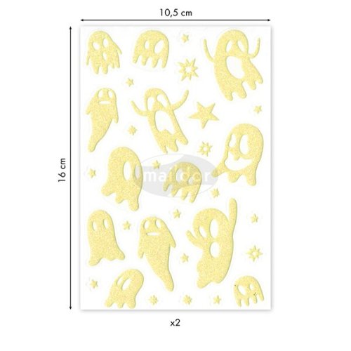 Samolepky Maildor Initial Phospho s motívmi duchov v trblietavom av tme fosforeskujúcom prevedení. Balenie obsahuje 2 listy, 2 motívy po 1 ks. Samolepky je možné zlúpnuť a znovu nalepiť. Rozmery balenia: 10,5 x 16 cm.