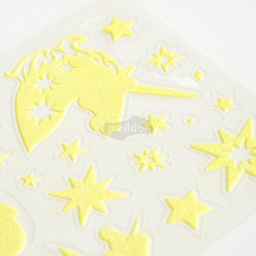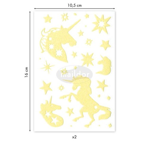 Samolepky Maildor Initial Phospho s motívmi jednorožcov v trblietavom av tme fosforeskujúcom prevedení. Balenie obsahuje 2 listy, 2 motívy po 1 ks. Samolepky je možné zlúpnuť a znovu nalepiť. Rozmery balenia: 10,5 x 16 cm.