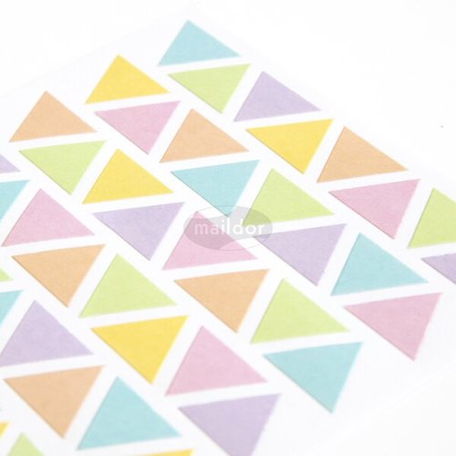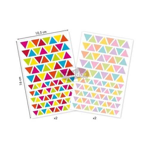 Samolepky Maildor Inital s rôznymi farbami a veľkosťami trojuholníkov. Balenie obsahuje 4 listy, 2 motívy po 2 ks. Samolepky je možné zlúpnuť a znovu nalepiť. Rozmery balenia: 10,5 x 16 cm.