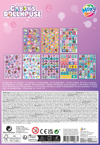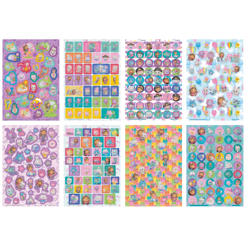 Trblietavé samolepky s motívom postavičiek z rozprávky Gábinin kúzelný domček. V zošite 8 hárkov. Rozmery 15x21 cm. Vek 3+