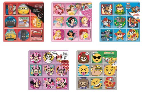 Samolepky v krabičke 36 kusov 10,5x10,5x1,5 cm 5 druhov (The Cars, Princezné, Paw Patrol, Minnie a Emojis). Nie je možné zvoliť druh, dodávame podľa skladovej dostupnosti.