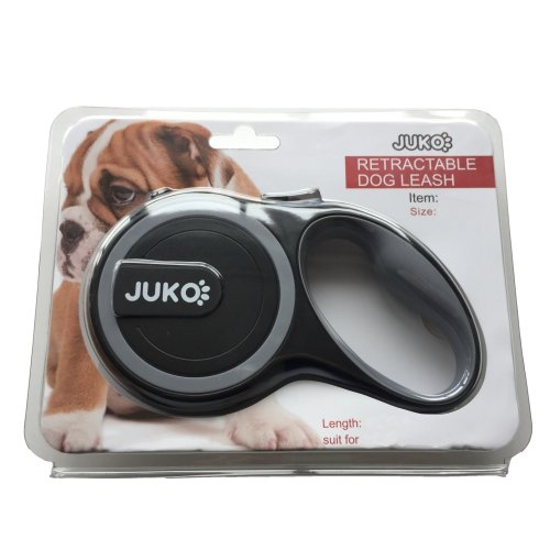 Na konci navíjaného pásika je umiestnená karabína na pripnutie k obojku.
