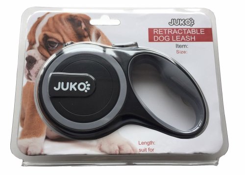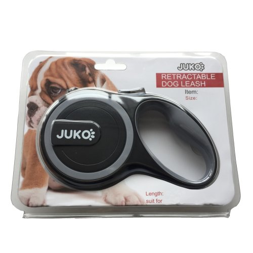 Na konci navíjaného pásika je umiestnená karabína na pripnutie k obojku.