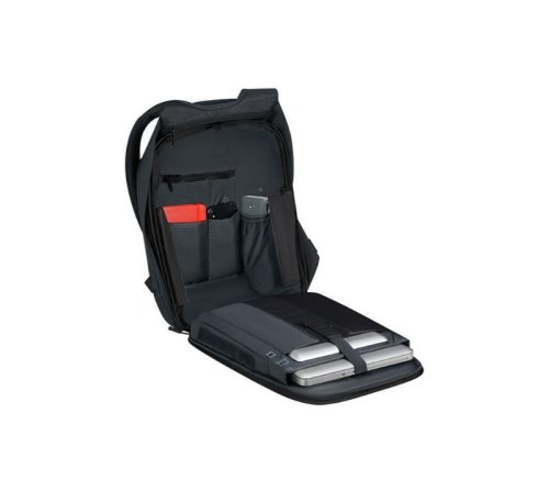 prístup do hlavného priestoru iba z chrbtovej časti Smart Sleeve - ,návleková chopeň, - slúžiaca k ľahkému pripevneniu na rukoväť kufra priestor na tablet o veľkosti 10.5" ergonomické popruhy polstrovaný priestor pre notebook o veľkosti 14" vodeodolný skryté bočné vrecká a horné vrecko RFID skryté na fľašu vrecko na power banku reflexné prvky rozmer 28 x 41,5 x 15 cm váha: 0,7 kg objem: 13 l Záruka 2 roky.