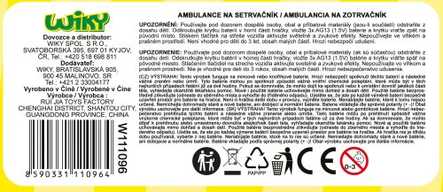 Sanitka, dĺžka 14,5 cm. Svetelné a zvukové efekty, aktivácia tlačidlami. 3xAG13 batérie súčasťou. Pohon na zotrvačník.
