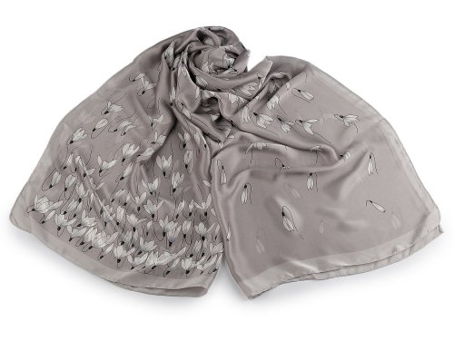 Elegantný saténový šál s kvetmi je ľahučký a mäkký, na dotyk pripomína hodváb. Využijete ju do spoločnosti aj na všedné nosenie ku kabátu, saku, blúzke, svetríku, šatám apod.