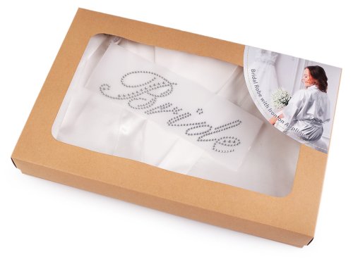 Saténový župan s krátkym rukávom zalichotí každej postave. Pre nevesty je ich svadobný deň výnimočný a župan pri prípravách zaistí pohodlie. Zároveň bude nádherným doplnkom videí a fotografií zo zákulisia príprav. Súčasťou balenia je hot-fixová kamienková aplikácia s nápisom "Nevesta" či anglicky "Bride". Nevesta sa môže sama rozhodnúť, či použije župan bez aplikácie, alebo si ju naň nažehlí. Návod je vo vnútri balenia. V páse sa župan zaväzuje saténovým pásikom. Župan je zabalený v priehľadnej darčekovej krabici. Rozmery: Dĺžka župana: 92 cm Obvod cez prsia: 124 cm Obvod cez boky: 124 cm Dĺžka rukáva: 27 cm Rozmery kamienkovej aplikácie sú cca 5,5 x 18,5 cm.