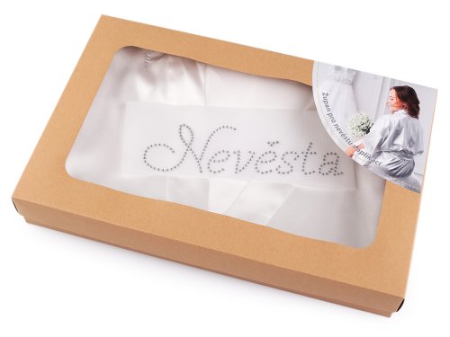 Saténový župan s krátkym rukávom zalichotí každej postave. Pre nevesty je ich svadobný deň výnimočný a župan pri prípravách zaistí pohodlie. Zároveň bude nádherným doplnkom videí a fotografií zo zákulisia príprav. Súčasťou balenia je hot-fixová kamienková aplikácia s nápisom "Nevesta" či anglicky "Bride". Nevesta sa môže sama rozhodnúť, či použije župan bez aplikácie, alebo si ju naň nažehlí. Návod je vo vnútri balenia. V páse sa župan zaväzuje saténovým pásikom. Župan je zabalený v priehľadnej darčekovej krabici. Rozmery: Dĺžka župana: 92 cm Obvod cez prsia: 124 cm Obvod cez boky: 124 cm Dĺžka rukáva: 27 cm Rozmery kamienkovej aplikácie sú cca 5,5 x 18,5 cm.