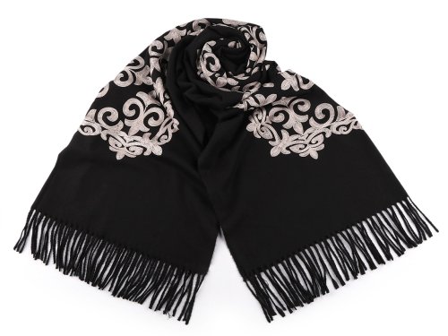 Veľký vlnený šál s ornamentálnou výšivkou je veľmi kvalitný, komfortne vás zahreje v sychravých dňoch. Je vyrobená z materiálu príjemne hebkého na dotyk. Na koncoch je zakončená dlhými strapcami. Môžete ju nosiť do práce aj do spoločnosti, výšivka má jemný lesk, elegantný dozdobí váš outfit. Upozorňujeme zákazníkov, že zloženie na štítkoch sa môže líšiť, materiál je vlna, polyester a viskóza.