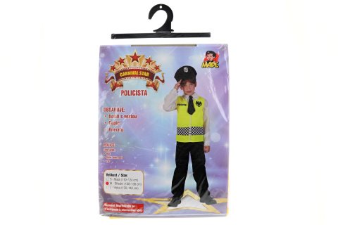Karnevalový kostým - Polícia. Balenie obsahuje košeľu s vestou, čiapku a kravatu. Veľkosť 120-130 cm. Rozmery balenia 30x46x2 cm.