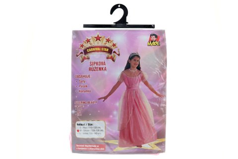 Detský kostým Šípková Ruženka. Obsahuje šaty, opasok, korunku, neobsahuje topánky. Rozmery balenia 30 x 46 cm.