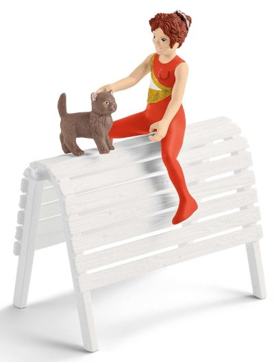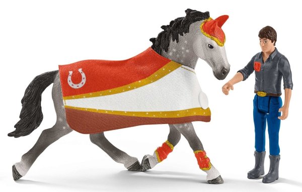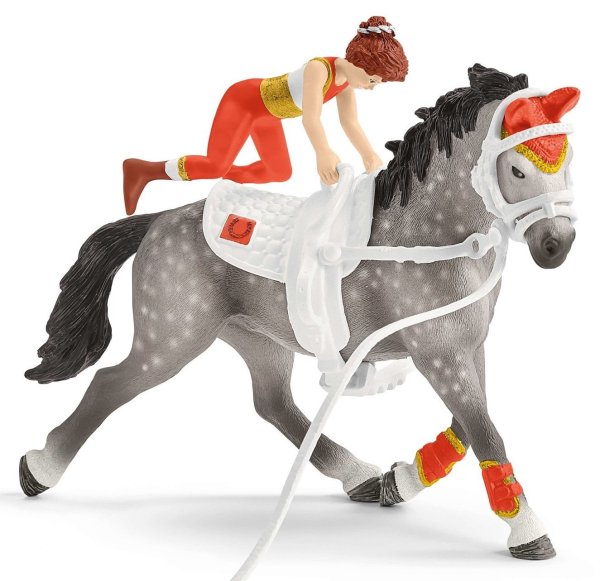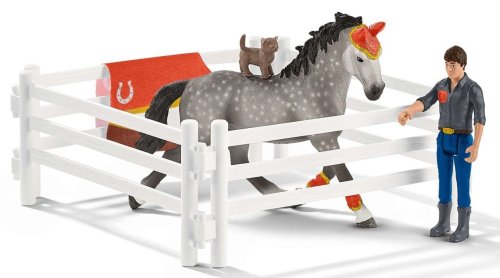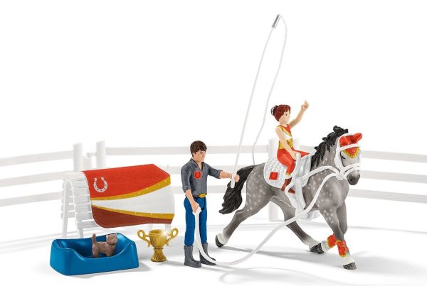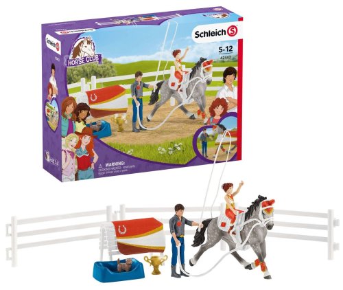 Kto vyhrá veľkú súťaž? Figúrky a doplnky z kolekcie Horse Club sú prepracované do posledného detailu a priblížia ti život v stajni a okolo nej. Prenikni do sveta chovu koní, nazbieraj figúrky a kúp si vlastnú jazdeckú stajňu. Balenie obsahuje: 1x dievčatko Mia s pohyblivými pažami, 1x tréner Tom s pohyblivými končatinami, 1x turnajový kôň, 1x mačka, 1x sedlo, 1x uzda, 2x martingale, 1x lano, 1x bič, 1x prikrývka, 1x držiak, 1x držiak 1x kôš, 4x ohrada Malé dievčatko Mia sa môže dokonale pripraviť na svoju prvú súťaž so setom pre vaulting. Inštruktor jazdy na koni, Tom, upokojuje koňa a jemne švihne bičom, ktorý drží vo svojej ruke, takže kôň beží rovnomerne v kruhu vo vnútri plotu, ktorý je možné zostaviť podľa potreby. Mia, sestra Hannah, má pohyblivé paže a dokáže držať veľkú zlatú trofej. Sedlo, uzda a prikrývka je možné zložiť a po tréningu sa ukladajú na úložnú lavicu. Hnedé mačiatko so záujmom sleduje udalosti a potom sa pritúli do svojho útulného koša. Schleich sú realistické a do detailov prepracované figúrky, kde sa dizajnéri sústredili na filozofiu tela, štruktúru svalov a celkový výraz postavičky. Deti sa tak môžu hrať so zvieratkami z celého sveta, pravekými dinosaurami, filmovými a rozprávkovými postavičkami, ktoré sú vernou kópiou svojich predlôh, a kúzelnými elfmi a vílami z magického sveta Bayala. Vhodné pre deti od 5 rokov.