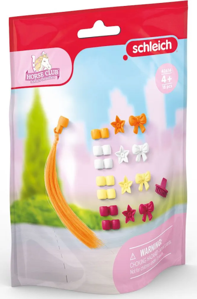 Jedinečné figúrky, ktoré sú ako živé! Je tu toľko možností! Tvoj kôň horí nedočkavosťou, až mu vyčešeš hrivu a potom ju ozdobíš korálkami. Alebo má radšej kvety alebo mašle? Možno od každého niečo. Vyberať si môžeš z rôznych farieb. Tak krásne vyčesaný kôň rozhodne vyhrá súťaž krásy! Malá kefa na prst dodá lesk každej hrive a chvostu! Figúrky a doplnky Schleich Horse Club sú prepracované do posledného detailu. Prenikni do sveta zvierat, nazbieraj figúrky a objav tak zvieratá našej planéty. Balenie obsahuje: 8x korálku do hrivy, 4x kvetina do hrivy, 4x mašľa do hrivy, 1x farebný prameň do hrivy, 1x hrebeň na prst. Rozmery: 15,5 x 12,5 x 0,3 cm. Schleich sú realistické a do detailov prepracované figúrky, kde sa dizajnéri sústredili na filozofiu tela, štruktúru svalov a celkový výraz postavičky. Deti sa tak môžu hrať so zvieratkami z celého sveta, pravekými dinosaurami, filmovými a rozprávkovými postavičkami, ktoré sú vernou kópiou svojich predlôh, a kúzelnými elfmi a vílami z magického sveta Bayala.