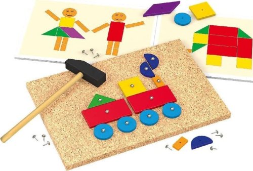 Tvorivá motorická hra pre malých domácich majstrov. Slon, raketa alebo motýľ - s kladivkom, klincami a 50 drevenými dielmi v rôznych farbách a tvaroch vznikajú na stabilnej korkovej doske farebné obrázky. Predlohy v rôznych úrovniach obtiažnosti podporujú jemnú motoriku malých remeselníkov a podnecujú ich fantáziu k navrhovaniu vlastných motívov. Pomocou kladivka deti jednoducho zaťukajú tvary do korkovej podložky a následne ich môžu zase rozobrať. Balenie obsahuje: korkovú podložku, 50 drevených dielikov rôznych tvarov, klinčeky, kladivko a predlohy.