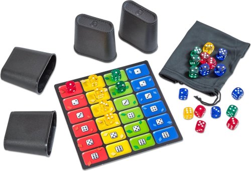 1 herná doska 24 kociek (po 6 v červenej, žltej, zelenej a modrej farbe) 4 tégliky na kocky 1 vrecúško