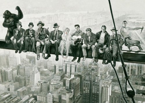 Paródia fotografie Čas obeda, rok 1932 od Renata Casara so známymi a slávnymi osobnosťami. Ich mená sú uvedené na zadnej strane krabičky od puzzle.