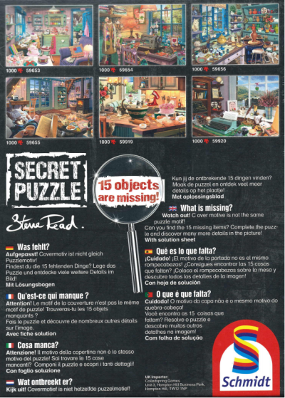 Skladanie môže byť ešte o niečo zábavnejšie. Puzzle zo špeciálnej Secret kolekcie od výrobcu Schmidt ponúka niečo navyše – 15 malých tajomstiev. Hľadať ich musíte vo vnútri. Pri skladaní puzzle narazíte na detaily, ktoré sa s predlohou nezhodujú. Vzorový obrázok na krabici totiž nie je úplne rovnaký ako puzzle. Nájdete všetkých 15 rozdielov? Rozmer zloženého puzzle cca 69,3 x 49,3 cm