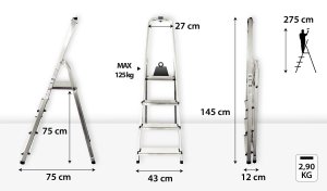 Výška schodíkov: 1,45 m Pracovná výška: 2.75 m Výška podesty: 0,75 m Šírka: 0,43 m Nosnosť: 125 kg Materiál: hliník/plast Hmotnosť: 2,9 kg Prepravný rozmer: 145x43x12 cm