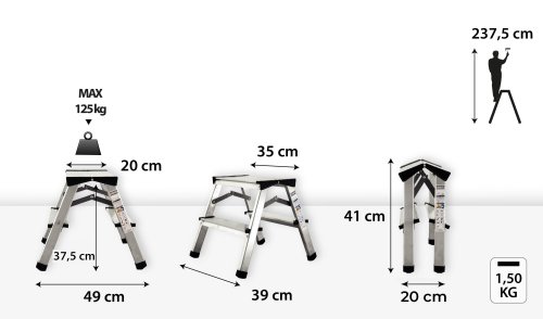 Výška schodíkov: 0,41 m Pracovná výška: 1,98 m Výška podesty: 0,38 m Šírka: 0,39 m Nosnosť: 125 kg Materiál: hliník Hmotnosť: 1,5 kg