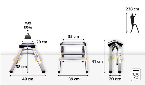 Výška schodíkov: 0,41 m Pracovná výška: 1,98 m Výška podesty: 0,38 m Šírka: 0,39 m Nosnosť: 150 kg Materiál: hliník/plast Hmotnosť: 1,7 kg EN 131 / EN 14183