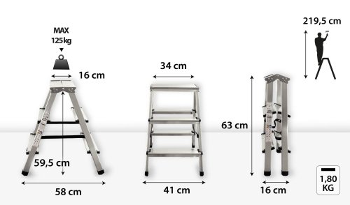 Výška schodíkov: 0,63 m Pracovná výška: 2,2 m Výška podesty: 0,60 m Šírka: 0,41 m Nosnosť: 125 kg Materiál: hliník Hmotnosť: 1,8 kg